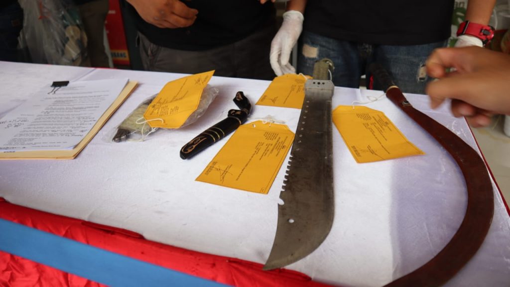 Barang bukti 1 (satu) buah senjata tajam jenis Celurit, 1 (satu) buah pedang besar bergerigi terbuat dari besi.1 (satu) buah pisau bersarungkan kayu warna hitam, 1 (satu) buah kaos jenis Polo warna abu bertuliskan Moonraker, 1 (satu) buah jaket warna merah bertuliskan Moonraker, dan 1 (satu) buah kaos lengan panjang bertuliskan M2R.