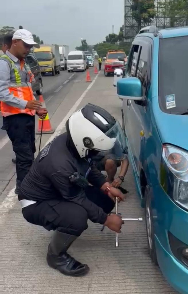 Pihaknya mengungkapkan, petugas yang sedang melakukan patroli pun langsung turun dari kendaraan untuk membantu memasang dan mengganti ban cadangan sehingga tanpa butuh waktu lama mobil pemudik tersebut bisa melanjutkan kembali perjalanan. Dan jika harus di derek, petugas derek sigap dalam melaksanakan tugasnya. Alhamdulilah sampai dengan malam ini kondisi lalin ramai lancar
