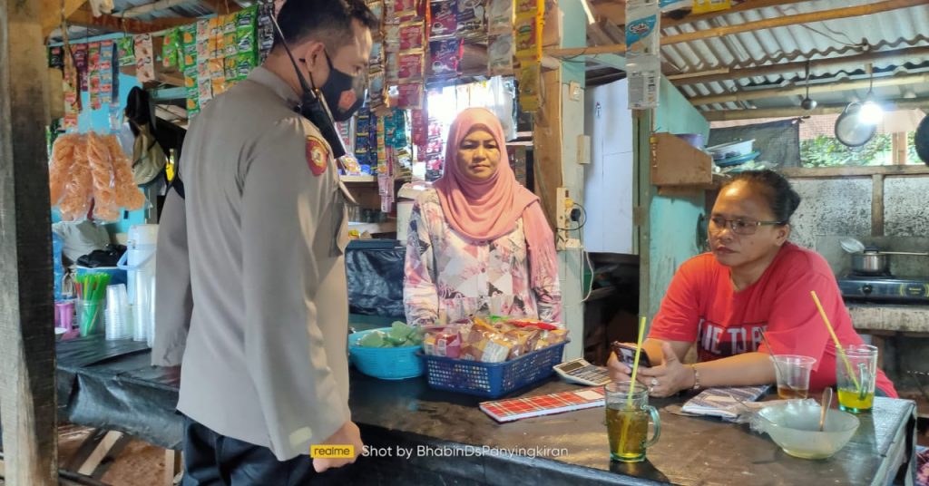 Aiptu Nanang Sukarya bersama dengan Bripka Ade Rahmat laksanakan kegiatan Penertiban Protokol Kesehatan, memberikan edukasi kepada masyarakat terkait PPKM (Pemberlakuan Pembatasan Kegiatan Masyarakat) Level 1.